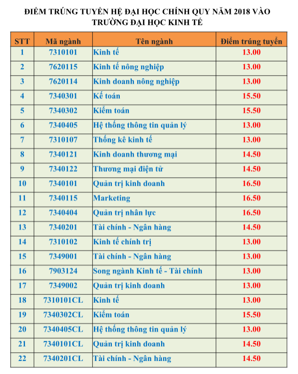 Cụ thể, trường đại học Khoa học Huế ngoại trừ ngành Báo chí lấy điểm chuẩn 13,75; Công nghệ thông tin lấy 13,5 điểm thì 22 ngành đào tạo còn lại đều có điểm chuẩn 13 điểm. Trường đại học Kinh tế Huế có 11/22 ngành đạo tạo lấy điểm chuẩn là 13 điểm, cao nhất là ngành Quản trị kinh doanh, Marketing và Quản trị nhân lực với mức 16,5 điểm.