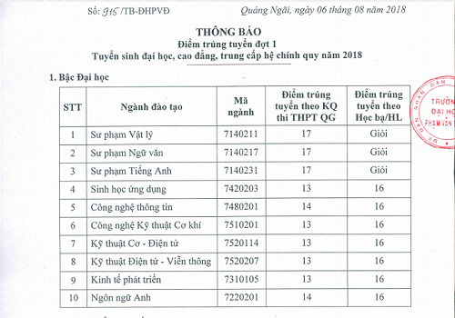 Trường đại học Phạm Văn Đồng, Quãng Ngãi có 5/10 ngành bậc đại học lấy điểm chuẩn trúng tuyển là 13 điểm. Trường đại học Quy Nhơn, ngoại trừ các ngành đào tạo sư phạm lấy điểm chuẩn 17 điểm, còn lại có 32/46 ngành lấy điểm chuẩn trúng tuyển là 14 điểm. Tương tự, trường đại học Quảng Bình ngoại trừ 7 ngành đào tạo sư phạm lấy điểm chuẩn 17 điểm, 13 ngành còn lại của trường này lấy điểm trúng tuyển là 14; trường đại học Hà Tĩnh, ngoại trừ chương trình đào tạo giáo viên lấy 17 điểm, các ngành còn lại lấy điểm chuẩn 13,5…