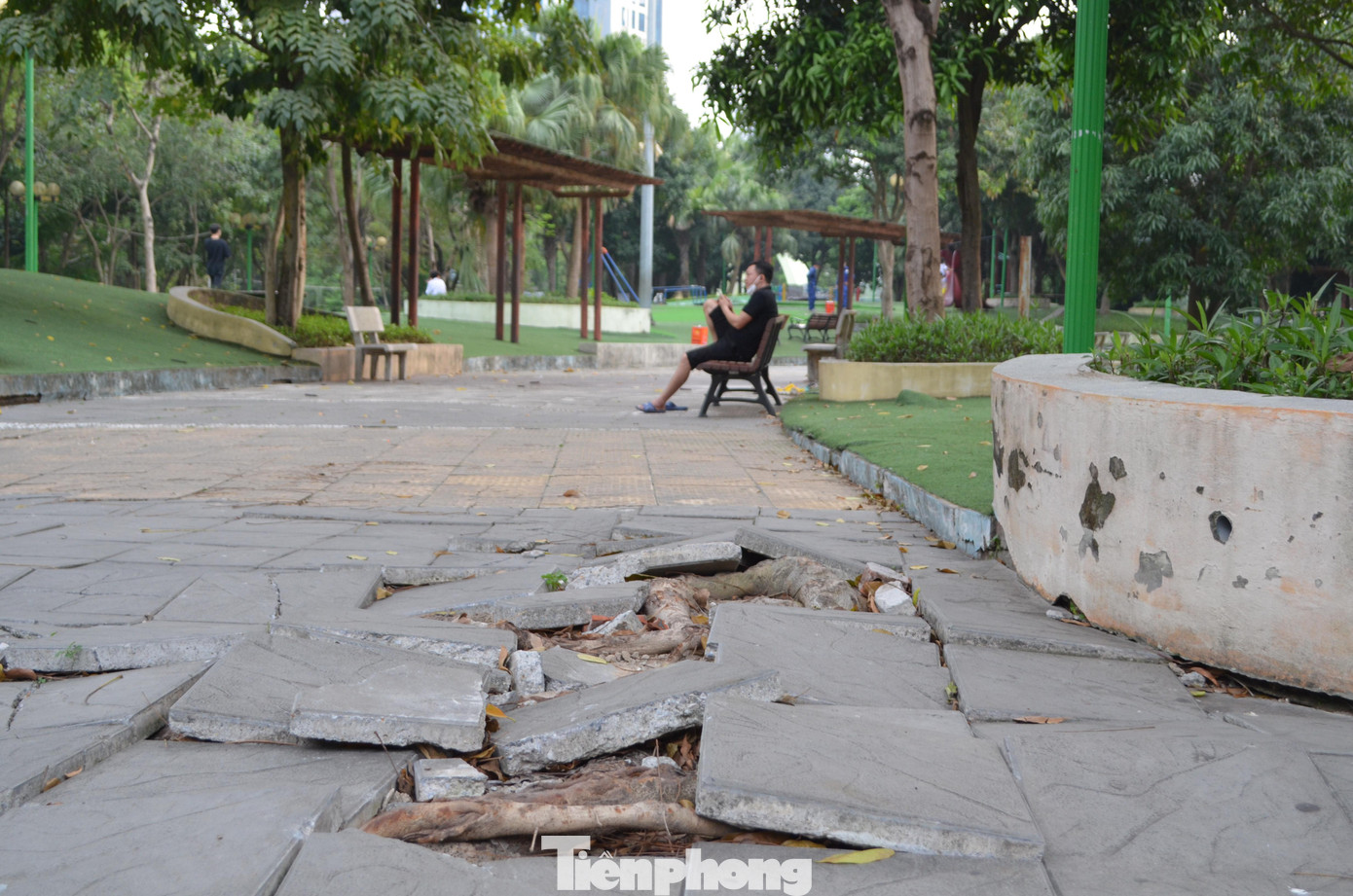 TPO - Tại khu vui chơi trẻ em trong công viên Cầu Giấy, nhiều thảm cỏ nhân tạo bị rách, loang lổ, bê tông trồi lên. Nhiều đường đi, bồn cây bị bong tróc, sụt trượt tiềm ẩn nhiều nguy hiểm cho người dân...