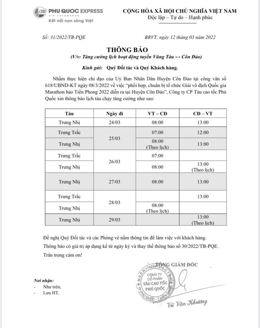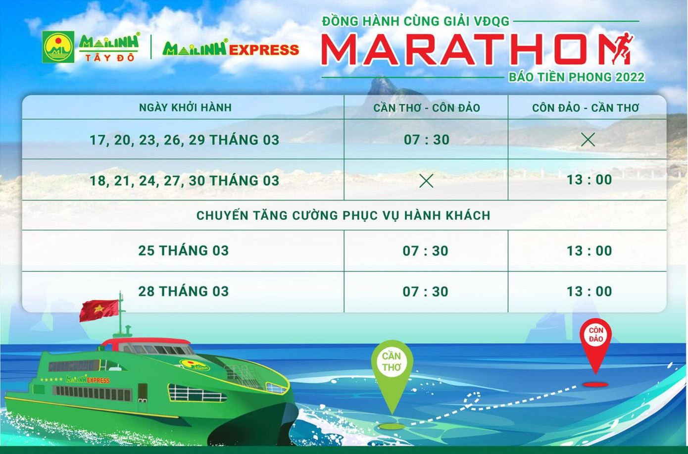 Nhận công văn của UBND huyện Côn Đảo về việc phối hợp và chuẩn bị tổ chức Tiền Phong Marathon 2022, cả ba hãng tàu trên cam kết sẽ tăng cường chuyến, nhằm đáp ứng nhu cầu đi lại của VĐV, BTC, khách mời và khán giả cổ vũ tại giải đấu uy tín và có tuổi đời lâu nhất của thể thao Việt Nam.