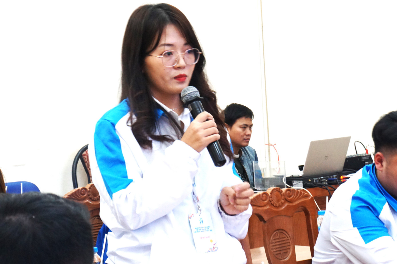 Đại biểu Bùi Thị Thu Hải - Đoàn Đại biểu Hội Sinh viên tỉnh Đắk Lắk, góp ý kiến về nội dung “Rèn luyện lý tưởng, đạo đức ở sinh viên dân tộc thiểu số và tôn giáo”.