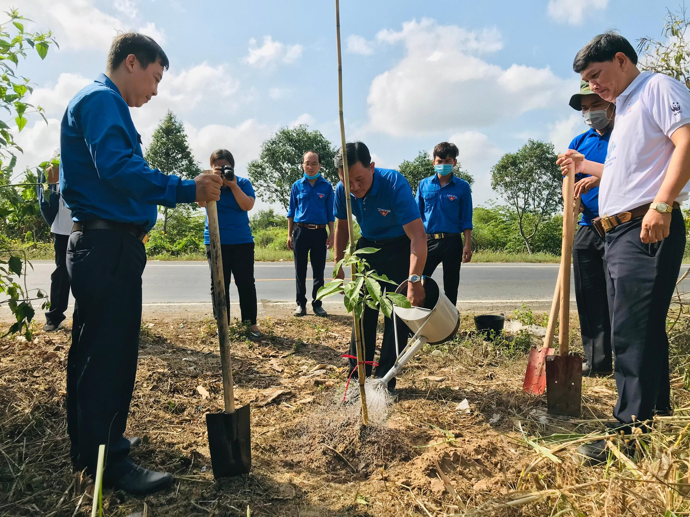 | Lãnh đạo Thành đoàn và Cty điện lực TP Cần Thơ trồng cây xanh. - Ảnh: TĐCT |