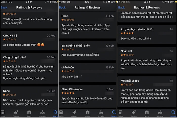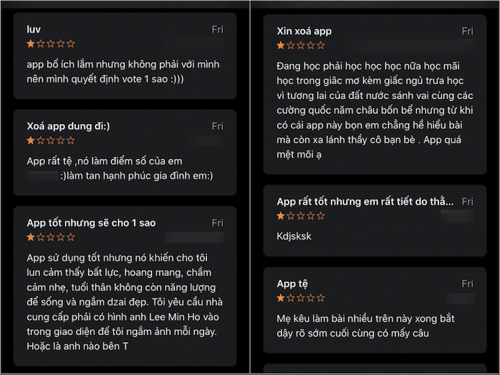 Bên cạnh đó, nhiều học sinh còn cố tình đánh giá 1 sao ứng dụng vì các lý do không tưởng như: “Tại ứng dụng mà nhà trường bắt học online”, “Ứng dụng phá tan hạnh phúc gia đình”, “Ứng dụng rất tốt nhưng mà em rất tiếc. Ứng dụng phá hoại kỳ nghỉ của em, khiến em trầm cảm”, “Ứng dụng rất tốt nhưng em không thể cưỡng lại được sự lười biếng của bản thân, hiểu cho em”, “Mong ứng dụng nhận được nhiều 1 sao để nhanh bị gỡ bỏ để bọn em đỡ mệt"...