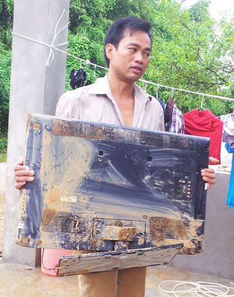 Chiếc tivi được moi ra trong đống đất đá, hiện không thể sử dụng.
