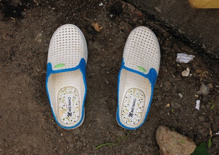 Tương tự, chị Hòa, một người bán vé số cũng đưa cho mọi người chiếc dép của mình cũng mua ở chợ tự phát có chất lạ và gây ngứa, sưng chân tương tự.