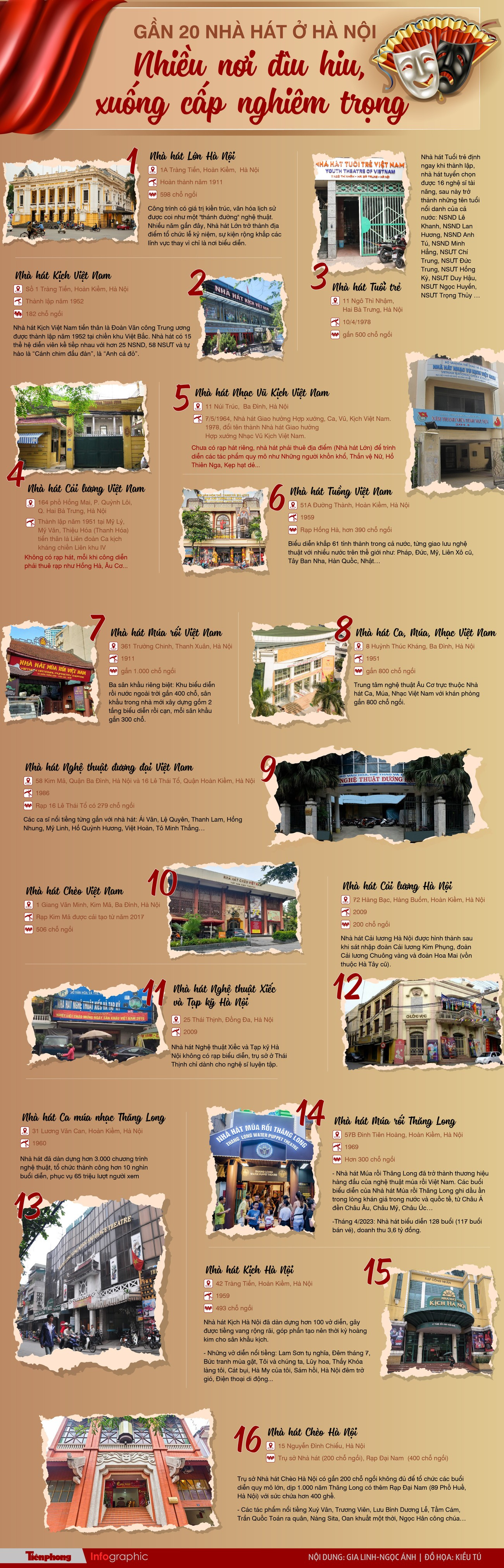 Hiện nay, tại Thủ đô Hà Nội có tới 20 nhà hát. Bộ Văn hóa, Thể thao và Du lịch quản lý 12 nhà hát, 6 nhà hát do Sở VHTT Hà Nội quản lý, chưa kể một số nhà hát thuộc các bộ, ngành. Một số nơi nghệ sĩ kể khổ “không có nhà để hát”, nhưng nhìn chung lại có hiện trạng vừa thừa, vừa thiếu. Một số nhà hát thường xuyên để rạp đóng cửa, hoặc cho thuê địa điểm cho mục đích phi nghệ thuật. Nhiều sân khấu vẫn đìu hiu, vắng khách vì cơ sở vật chất xuống cấp.