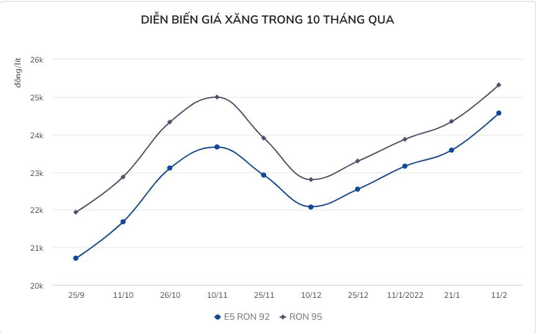 Ngày 11/2, giá xăng RON 95 trong nước vượt mốc 25.000 đồng/lít. So với đầu năm 2021, mặt hàng tăng gần 8.700 đồng/năm. Sau 3 lần tăng liên tiếp đầu năm, giá xăng hiện ở mức cao nhất trong vòng 8 năm và chỉ còn kém đỉnh lịch sử 1.069 đồng/lít đối với xăng E5 RON 92 và 818 đồng đối với xăng RON 95.