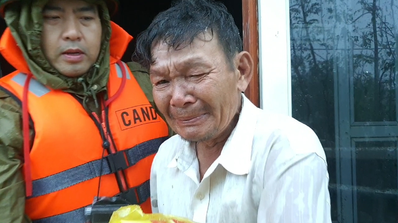 Tương tự gia đình ông Thông, hộ bà Trương Thị Sự cũng bị nước lũ dâng cao, tràn về nhanh gây cô lập. Khi lực lượng công an đến thăm hỏi, gửi tặng mì tôm, bánh, bà Sự không nén được sự xúc động.