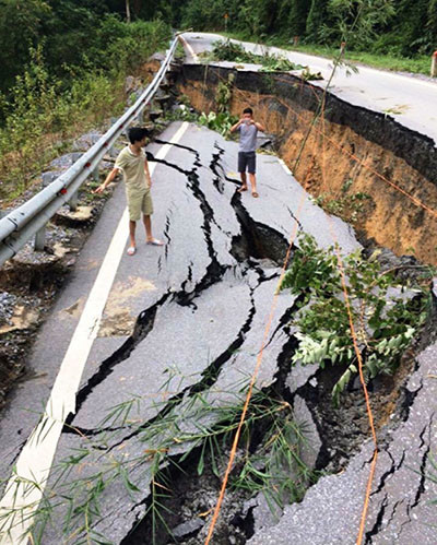 Điểm sạt lở ở xã Sơn Điện nặng nhất, mặt đường bị nứt toác, sụt lún kéo dài khoảng 10m, rộng hơn 3m, sâu gần 2m.