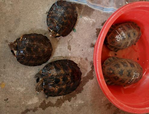 Có 7 con rắn độc gồm hổ mang chúa, hổ mang, ráo trâu với tổng trọng lượng 11,5 kg; 9 cá thể rùa núi vàng, rùa đất lớn và rùa đất Pulkin quý hiếm nặng gần 9,5 kg được tìm thấy trong những bao tải này. Tất cả đều còn sống.