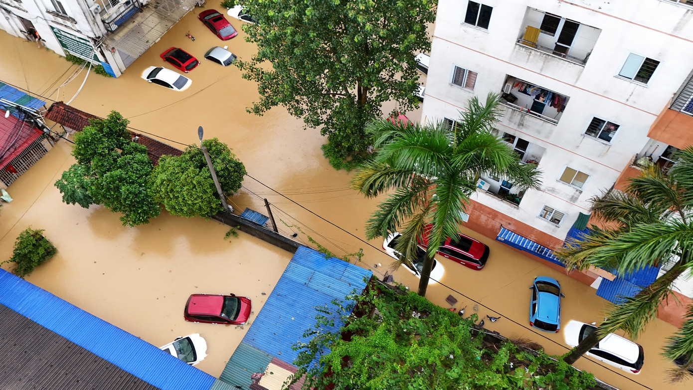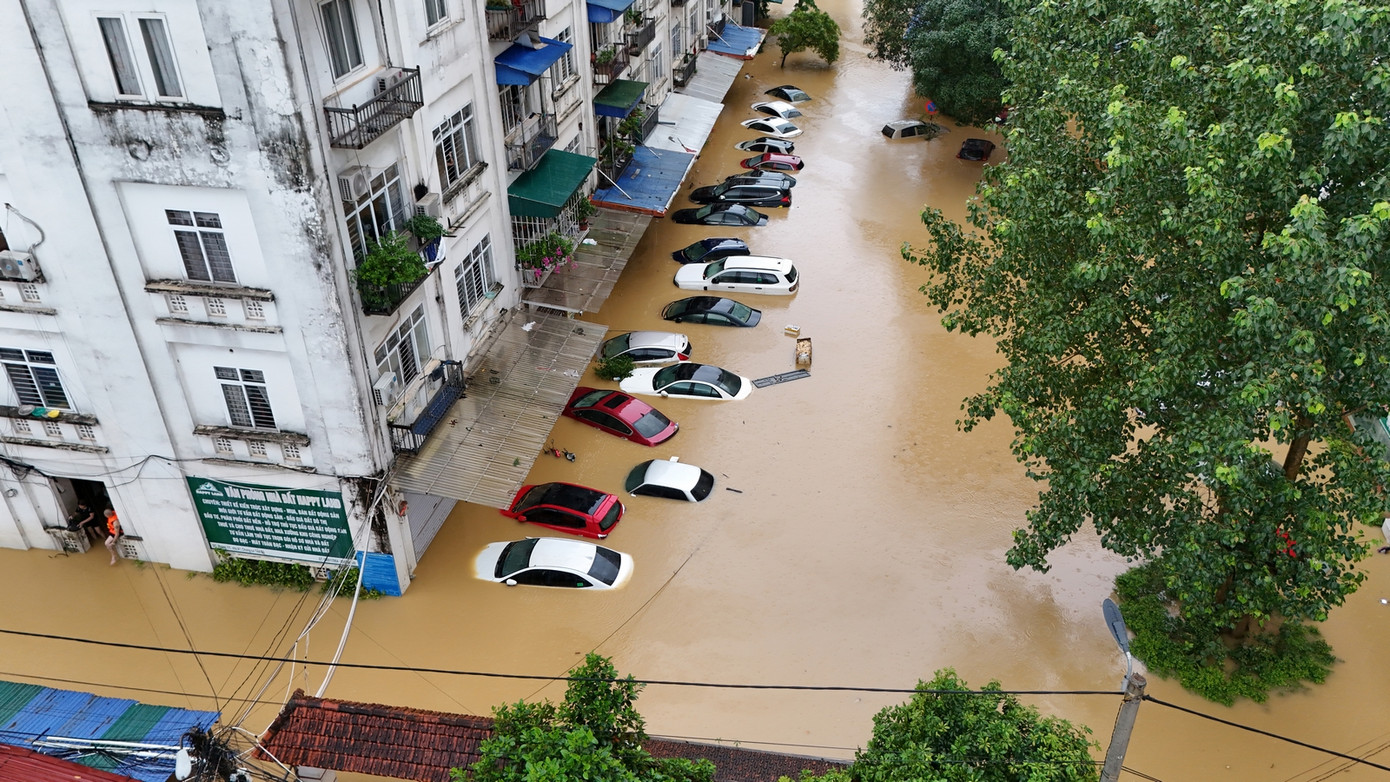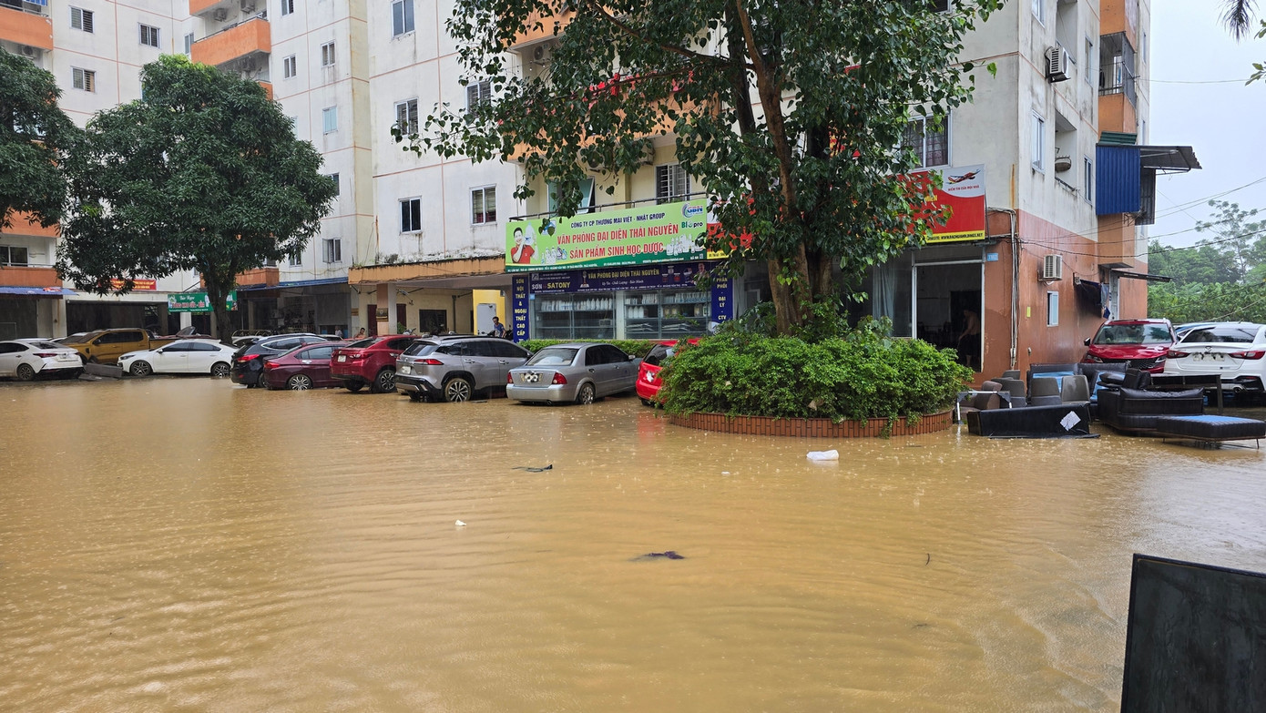Khu chung cư TBCO nằm gần khu vực sông Cầu (thành phố Thái Nguyên, tỉnh Thái Nguyên) ngập nặng khi nước lũ dâng cao. Ảnh: Hoàng Mạnh Thắng.