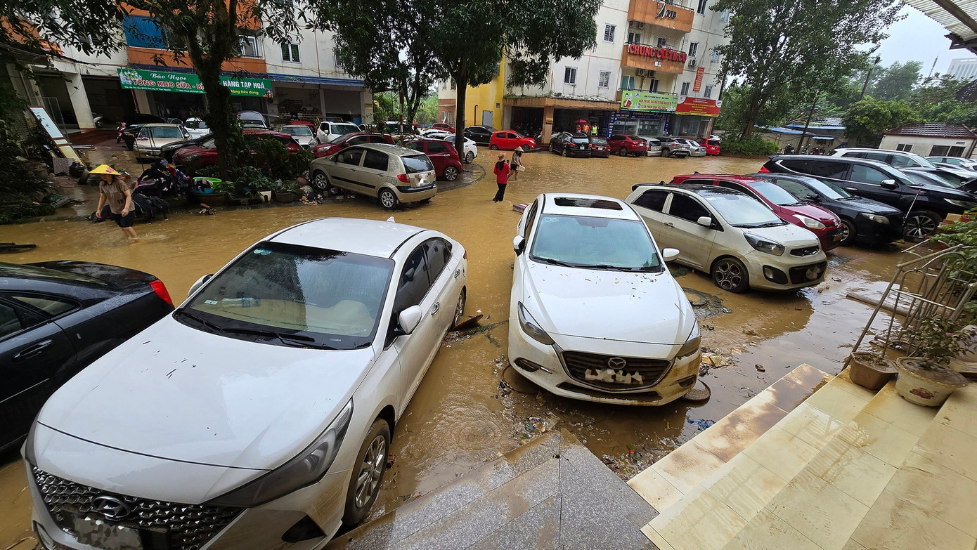 Nước dâng gây ngập lụt nhiều khu vực quanh khu chung cư. Nhiều xe ô tô đỗ trên sân chung cư bị ngập nặng. Ảnh: Hoàng Mạnh Thắng.