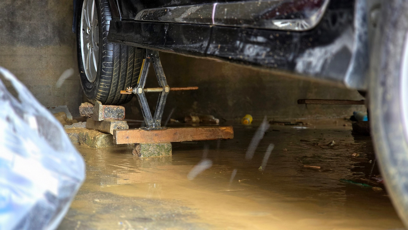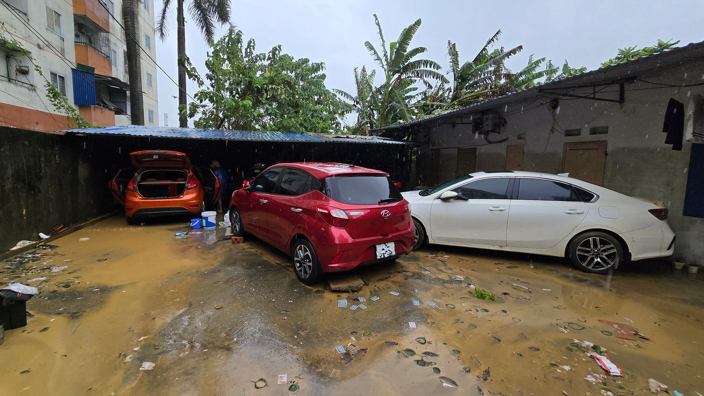 Theo chia sẻ của người dân, do sợ nước dâng lên ngập xe, họ đã để xe lên khu vực sân chung cư, thậm chí, cẩn thận kê xe cao trên các viên gạch, nhưng không ăn thua so với mực nước lũ. Ảnh: Hoàng Mạnh Thắng.