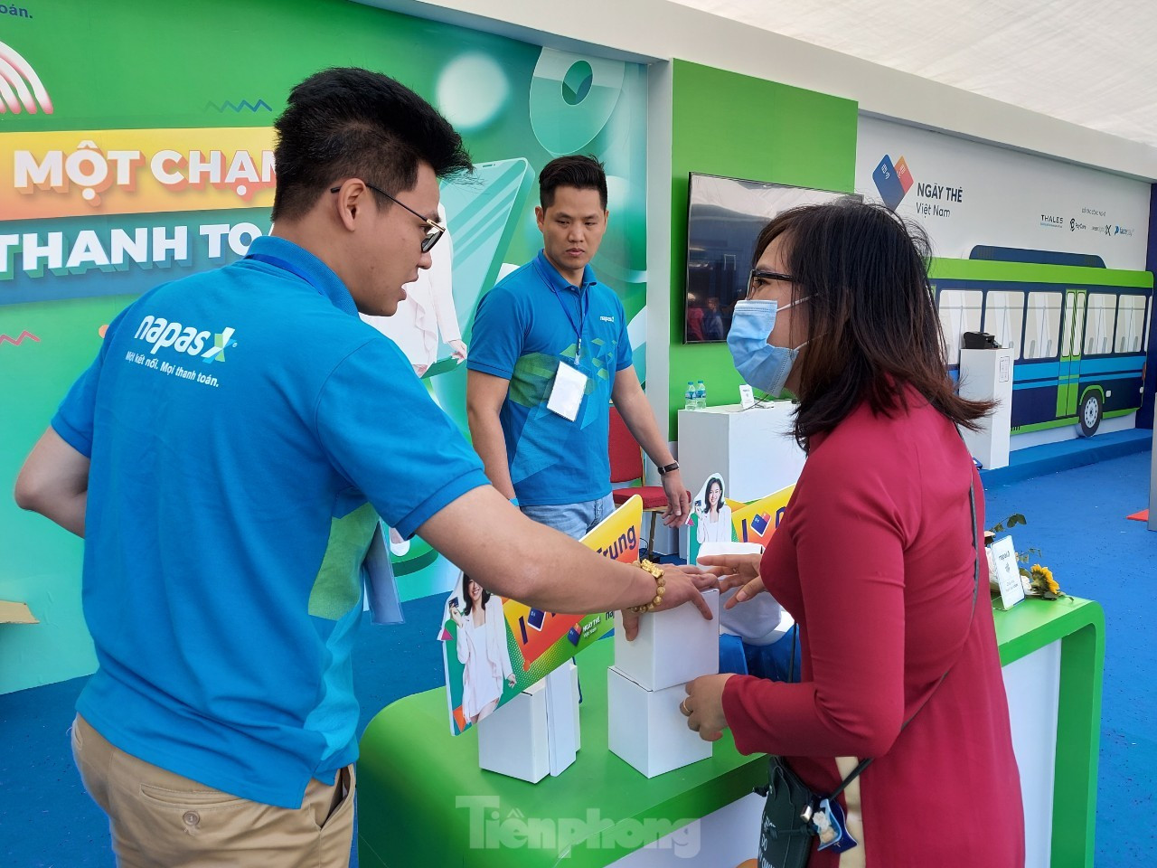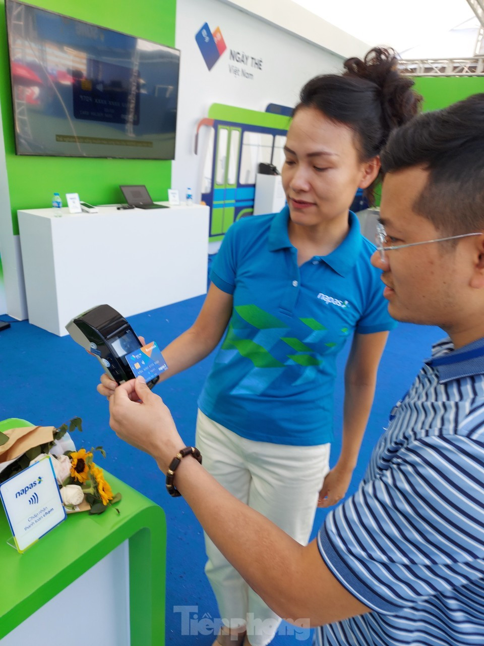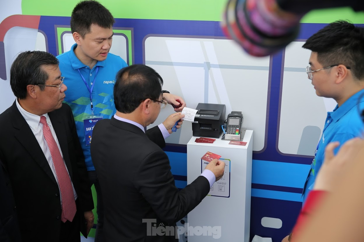 Phó Thống đốc Ngân hàng Nhà nước (NHNN) Nguyễn Kim Anh trải nghiệm quẹt thẻ để mua vé tàu điện ngầm tại gian hàng của Napas