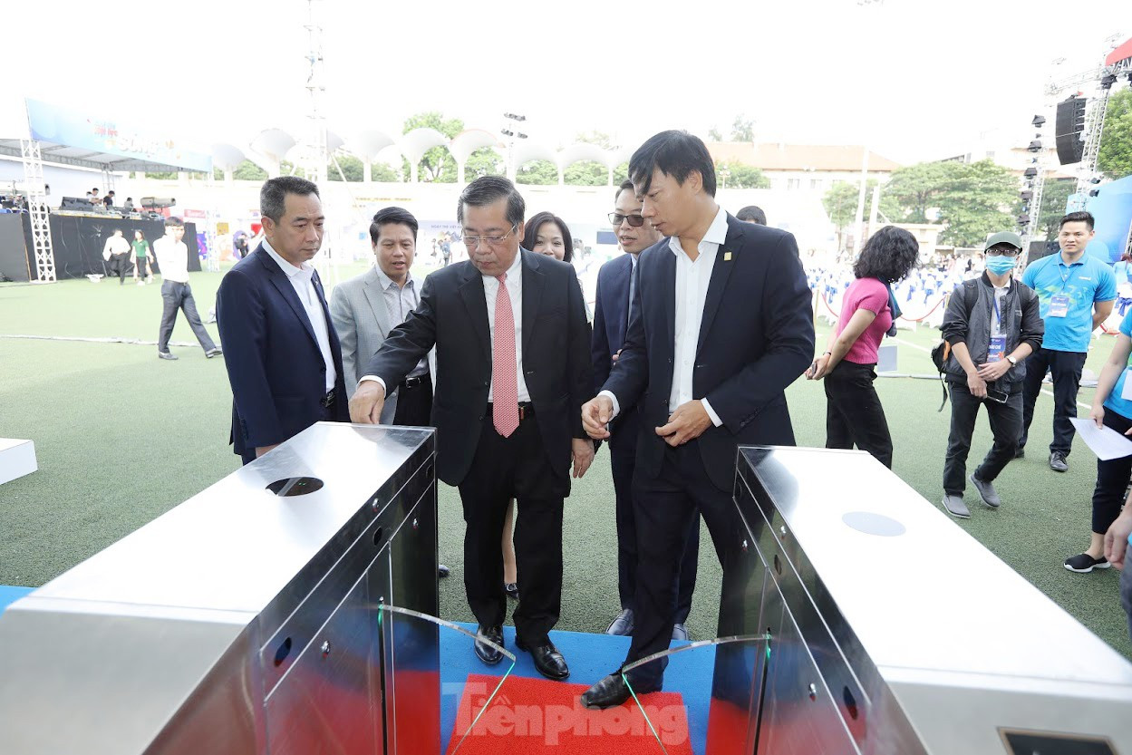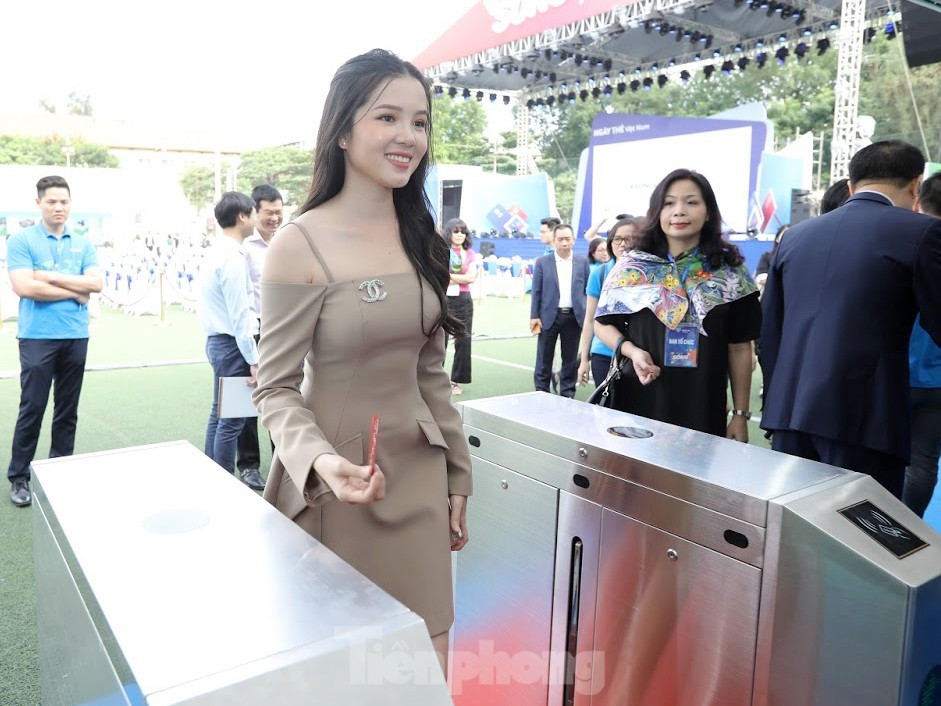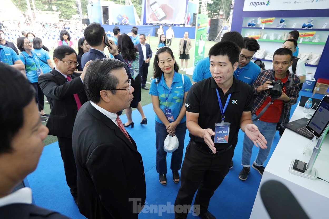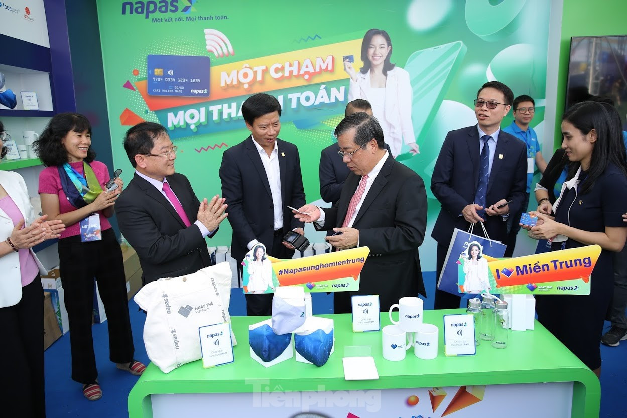 Phó Thống đốc Ngân hàng Nhà nước (NHNN) Nguyễn Kim Anh trải nghiệm quẹt thẻ để mua vé tàu điện ngầm tại gian hàng của Napas