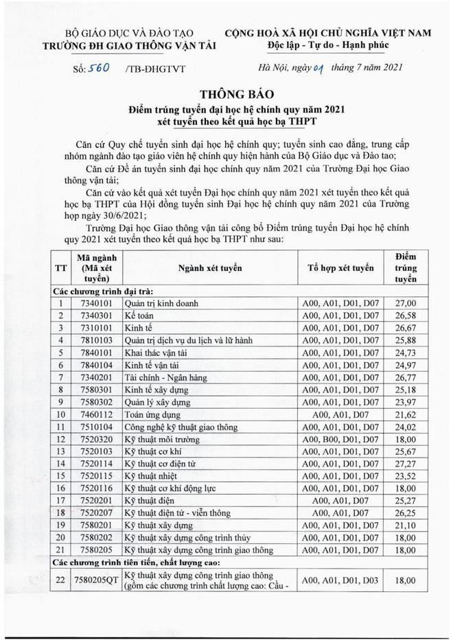 Thời gian xác nhận nhập học từ ngày 2/8 đến 17h ngày 5/8. Thí sinh có thể nộp hồ sơ xác nhận nhập học trực tiếp tại trường ĐH Giao thông Vận tải hoặc gửi hồ sơ chuyển phát nhanh qua đường bưu điện.