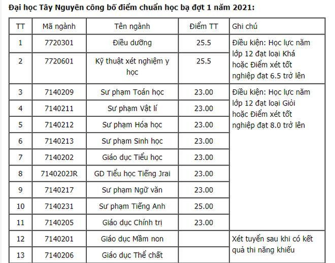 Hội đồng tuyển sinh trường ĐH Tây Nguyên công bố mức điểm trúng tuyển và danh sách đủ điểm trúng tuyển theo phương thức xét học bạ đợt 1 năm 2021 như sau: