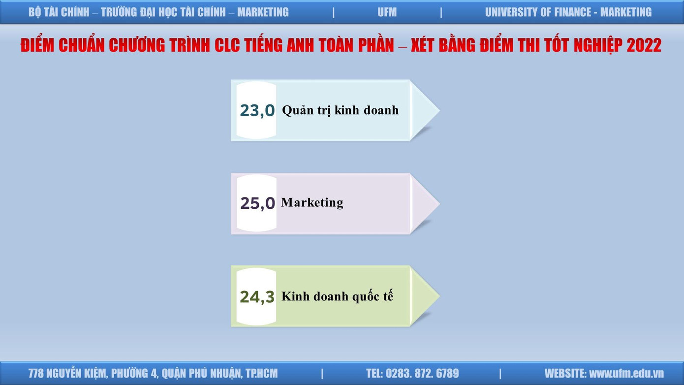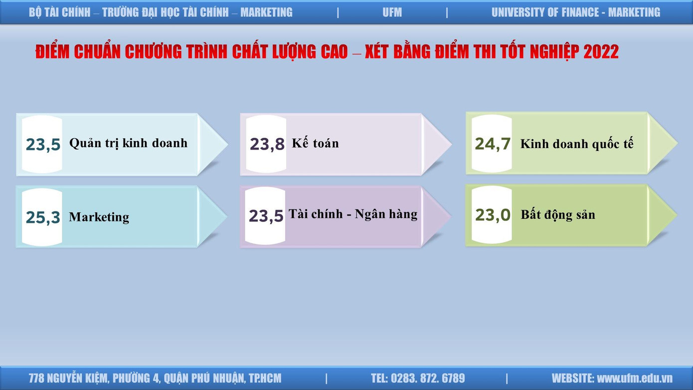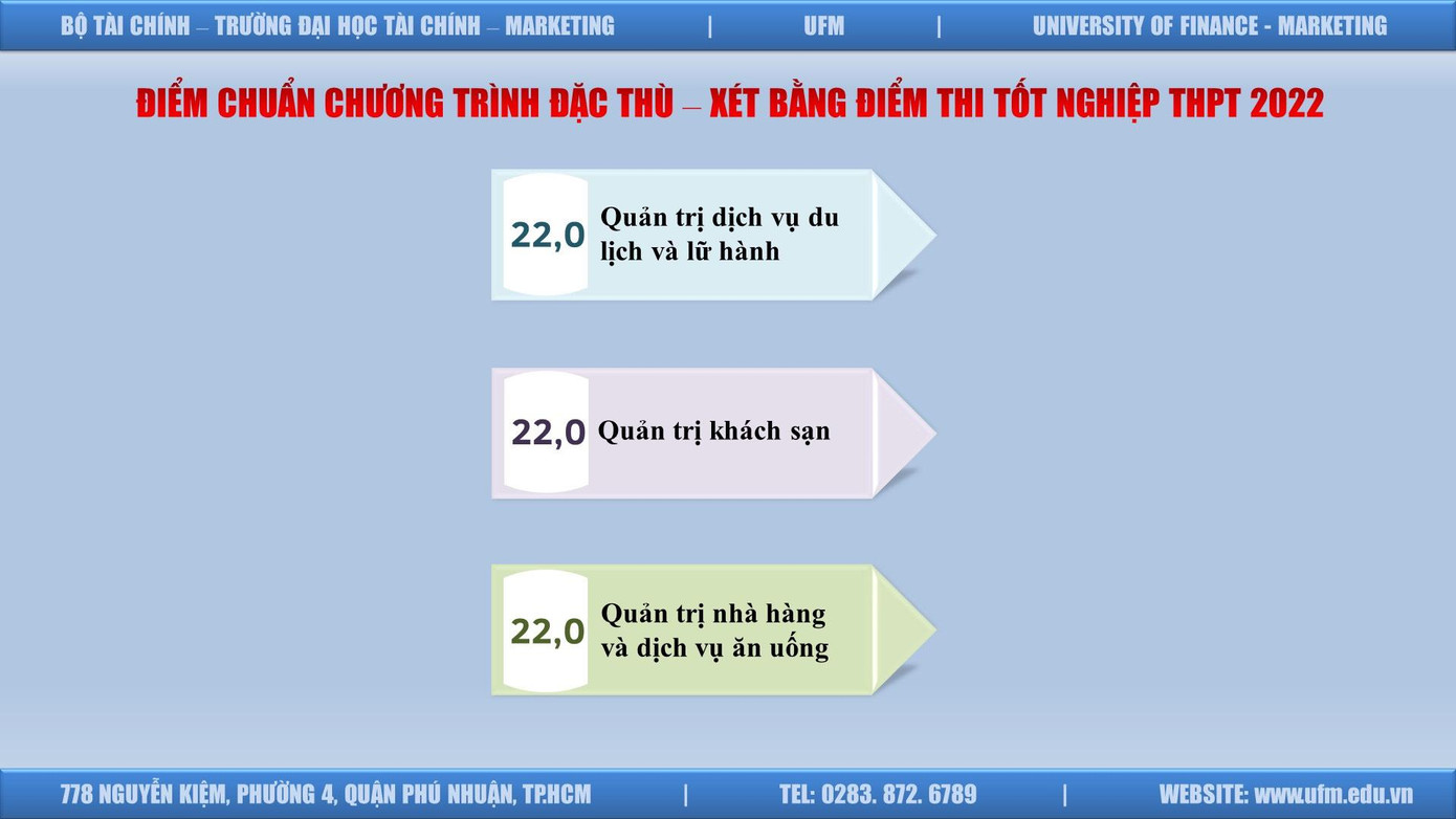Hội đồng tuyển sinh trường ĐH Tài chính - Marketing thông báo điểm trúng tuyển vào trình độ đại học chính quy năm 2022 đối với thí sinh sử dụng kết quả thi tốt nghiệp THPT năm 2022 đăng ký xét tuyển vào trường như sau: