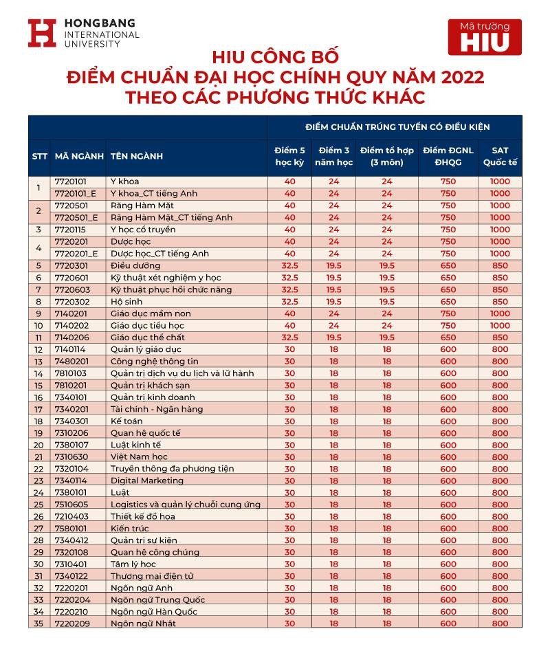 Ngoài ra, HIU công bố điểm chuẩn trúng tuyển 35 ngành đào tạo đại học chính quy của nhà trường theo các phương khác gồm: xét học bạ THPT, xét điểm kỳ thi đánh giá năng lực ĐHQG TP. HCM, Kỳ thi SAT.