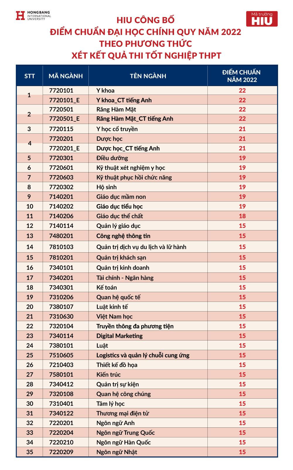Theo ThS Ngô Trí Dũng, Phó Giám đốc Phụ trách Trung tâm Tuyển sinh và Truyền thông, năm nay điểm chuẩn các ngành không thay đổi nhiều so với năm 2021, nhà trường dành tặng 200 suất học bổng cho Tân sinh viên nhập học sớm nhất trị giá 2 triệu đồng, HIU cam kết không tăng học phí trong suốt quá trình học. Căn cứ vào số lượng tân sinh viên nhập học thực tế từ ngày 16/9 đến 30/9, HIU sẽ xét tuyển bổ sung bằng hình thức trực tiếp hoặc trực tuyến đến hết ngày 5/10.