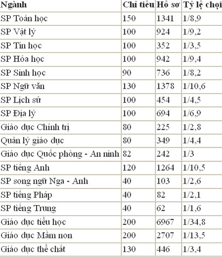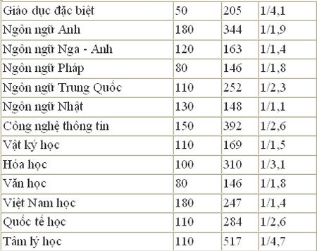 Đối với Trường ĐH Sư phạm TPHCM, tỷ lệ chọi từng ngành như sau: