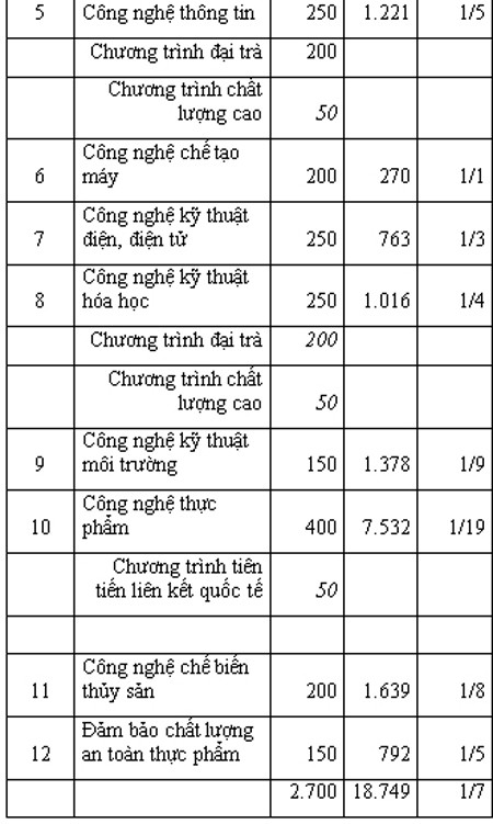 Đối với Trường ĐH Công nghiệp thực phẩm TPHCM, năm nay trường nhận được khoảng 21.000 hồ sơ (bậc ĐH, CĐ và liên thông), giảm 7.000 bộ so với năm ngoái. Tỷ lệ chọi từng ngành bậc ĐH như sau: