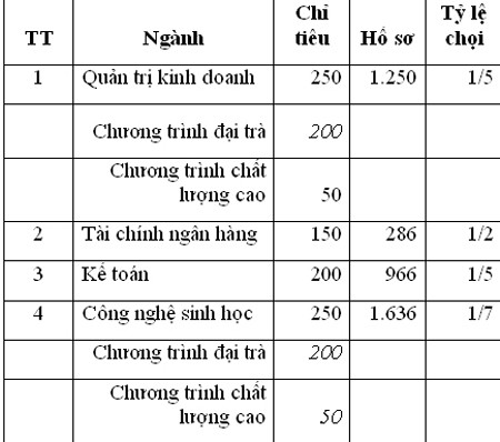 Cụ thể: Trường ĐH Ngân hàng TP.HCM có tỷ lệ chọi: Ngôn ngữ Anh 1/7,8 (1.565 hồ sơ/200 chỉ tiêu); luật kinh tế 1/4,9 (730/150); nhóm ngành kinh tế, kinh doanh và quản lý (tài chính ngân hàng, quản trị kinh doanh, kinh tế quốc tế, kế toán, hệ thống thông tin quản lý): 1/5 (11.374/2.300); bậc CĐ ngành tài chính ngân hàng 1/0,86 (86/100).