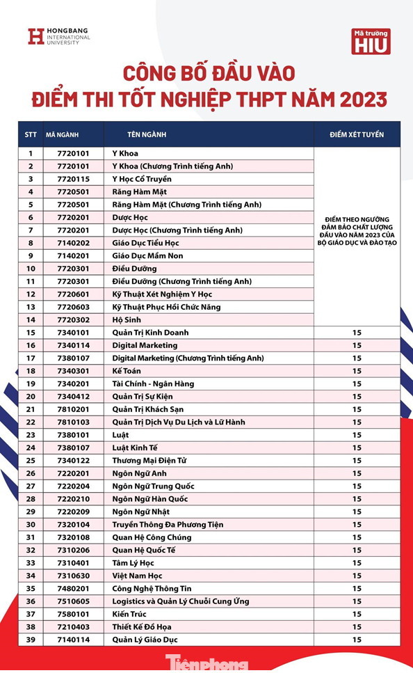 Hội đồng tuyển sinh trường ĐH Quốc tế Hồng Bàng cũng chính thức công bố điểm nhận hồ sơ xét tuyển (điểm sàn) bằng kết quả điểm thi Tốt nghiệp THPT 2023 dành cho 39 chương trình đào tạo đại học hệ chính quy.