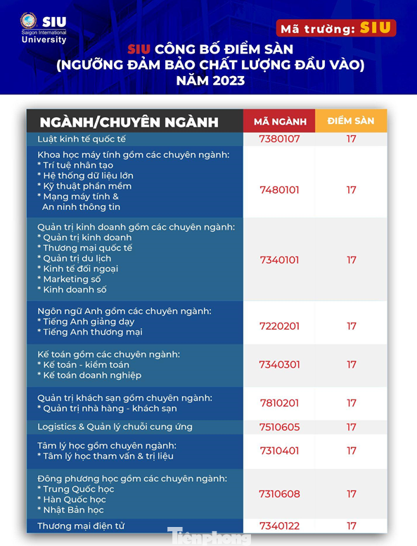 Cụ thể, tại Trường ĐH Quốc tế Sài Gòn, tất cả các ngành đều lấy mức từ 17 điểm (áp dụng cho phương thức xét kết quả kỳ thi tốt nghiệp THPT). Đây là mức điểm tối thiểu thí sinh cần đạt được để đăng ký xét tuyển vào trường.