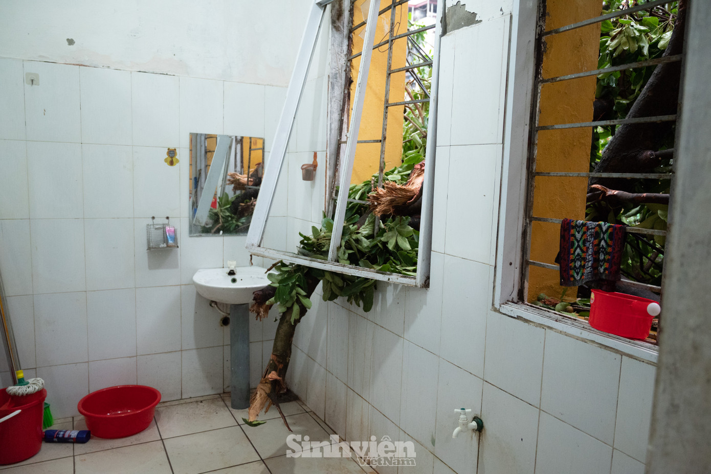 Bạn Vương Gia Khánh - tân sinh viên Đại học Bách khoa Hà Nội cho biết: "Khoảng 4 giờ 30 ngày 7/9, một cây to bất ngờ đổ vào nhà vệ sinh của phòng B5-100 KTX Đại học Bách khoa, cửa kính vỡ tan."