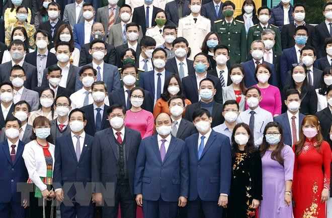 | Chủ tịch nước Nguyễn Xuân Phúc gặp mặt cán bộ y tế tiêu biểu toàn quốc. (Ảnh: Thống Nhất/TTXVN) |
