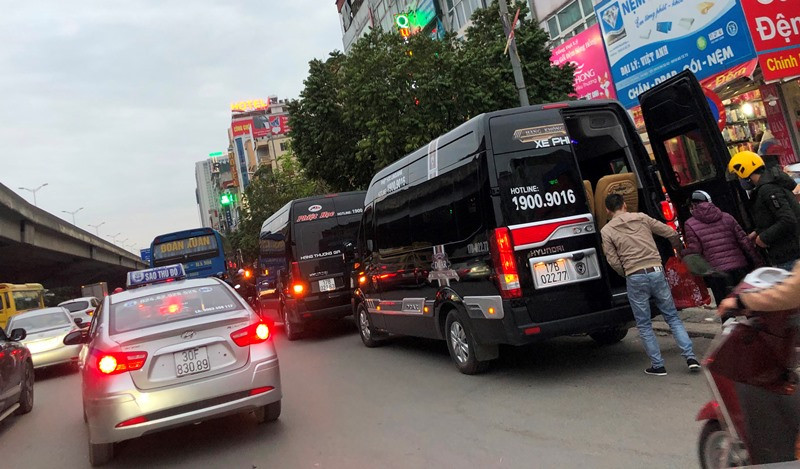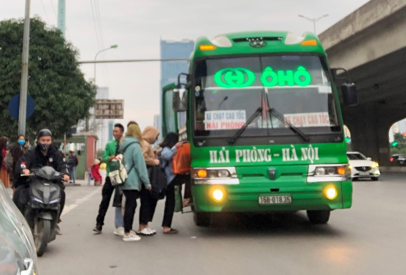 Xe vào nút giao đại lộ Thăng Long – Khuất Duy Tiến dừng bắt khách chủ yếu là xe của các nhà xe chạy tuyến Hải Phòng, Quảng Ninh, Thái Bình. Trong ảnh là xe 15B-018.35 của hãng vận tải Ô Hô, bắt khách chiều 16/2.