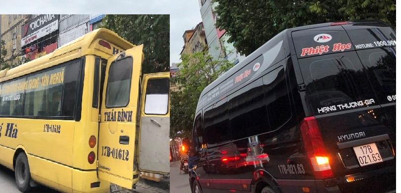 Các xe: 17B-016.12 của nhà xe Hoàng Hà, 17B-021.63 của nhà xe Phiệt Học cùng chạy tuyến Thái Bình dừng đỗ, bắt khạc tại khu vực nút giao Nguyễn Trãi – Khuất Duy Tiến.