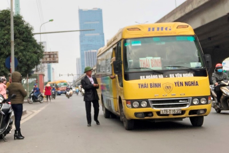Xe 17B-016.20 của hãng Hoàng Hà, chạy tuyến Thái Bình mở cửa chào mời khách tại nút giao đại lộ Thăng Long – Khuất Duy Tiến sáng 17/2.