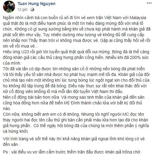 Anh viết: “Ngắm nhìn cảnh bà con buồn rủ xô đi tìm vé xem trận Việt Nam với Malaysia quả thật đó là một điều hạnh phúc, là một tín hiệu đáng mừng đối với nhà tổ chức. Không có gì sung sướng bằng khi vé chưa kịp phát hành mà khán giả đã phát sốt lên như vậy. Tuy nhiên dường như lượng vé không đủ để cung cấp nên khắp nơi thấy than trời vì không mua được vé. Gặp ai cũng thấy hỏi vé rồi xin vé rồi mua vé...