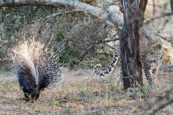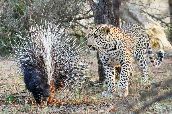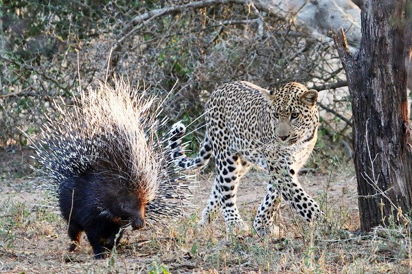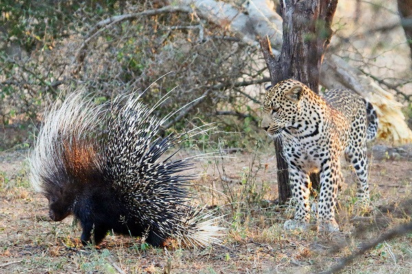 Thế nhưng ở vườn quốc gia Kruger (Nam Phi) mới đây, nhiếp ảnh gia nghiệp dư Wolfie van Eck (36 tuổi) đã chụp được hình ảnh đặc biệt: một con nhím xù gai dọa báo đốm đang rình rập ăn thịt mình.
