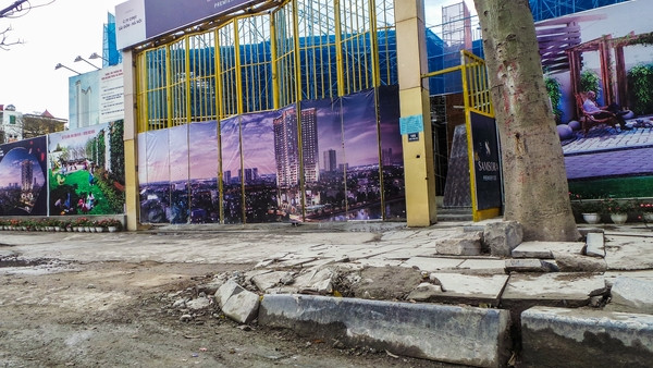 Vỉa hè vỡ nát trước cổng công trình dự án trung tâm thương mại Samsora của Cty CPĐT Sài Gòn – Hà Nội trên phố Chu Văn An (Hà Đông, Hà Nội).