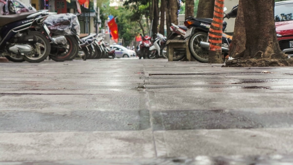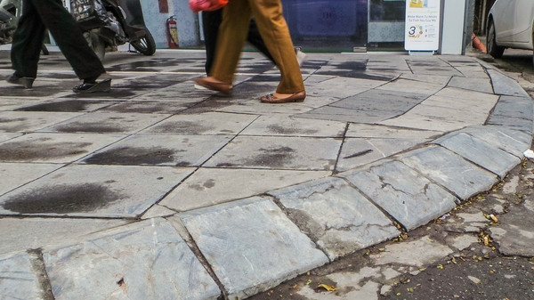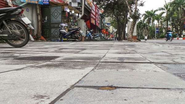 Nền vỉa hè lát đá tự nhiên cũng nhấp nhô lên xuống.
