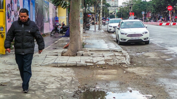 Vỉa hè trên nhiều tuyến phố thuộc quận Hà Đông mới lát đã hỏng.