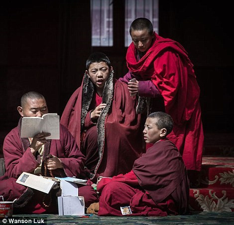 Các tu sĩ tập ngồi bên trong ngôi đền lớn nhất ở thung lũng Larung để cầu nguyện.