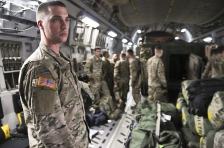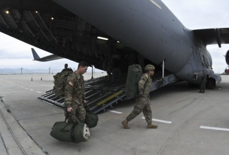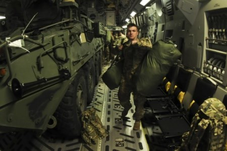 Một binh sĩ đang vác hành lý ra khỏi máy bay.