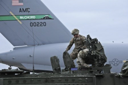 Sau diễn tập với Romania, hôm 29/3, một vận tải cơ C-17 Globemaster Mỹ mang theo các xe thiết giáp đã hạ cánh xuống sân bay Burgas của Bulgaria.