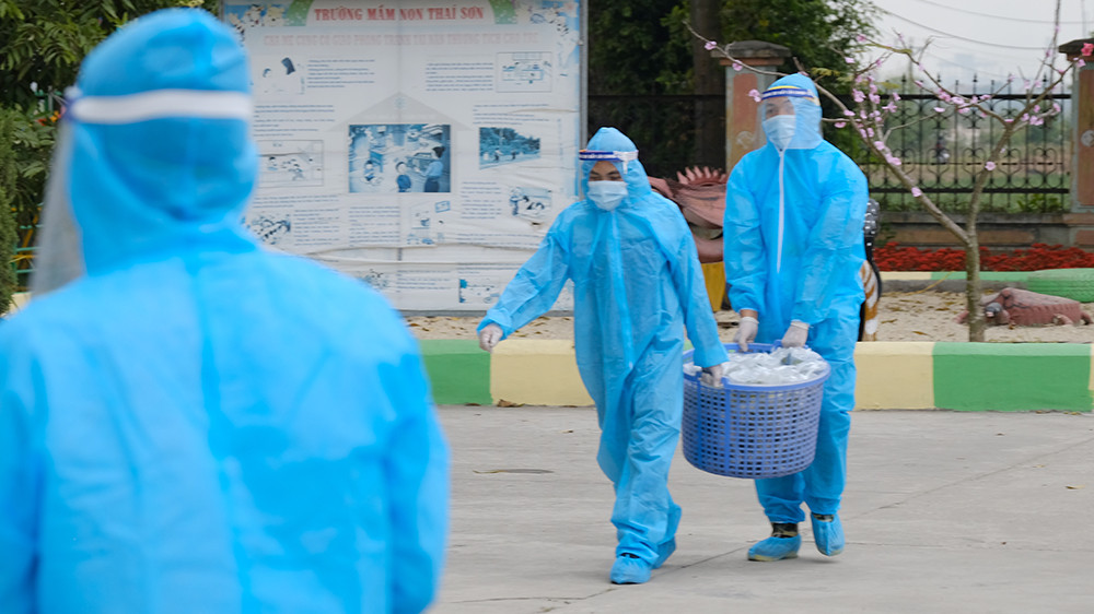 Suất ăn được vận chuyển tới khu cách ly tập trung tại trường Mầm non Phạm Thái. Nơi đây, hàng trăm học sinh tiểu học cùng một số trẻ nhỏ đang được cách ly.