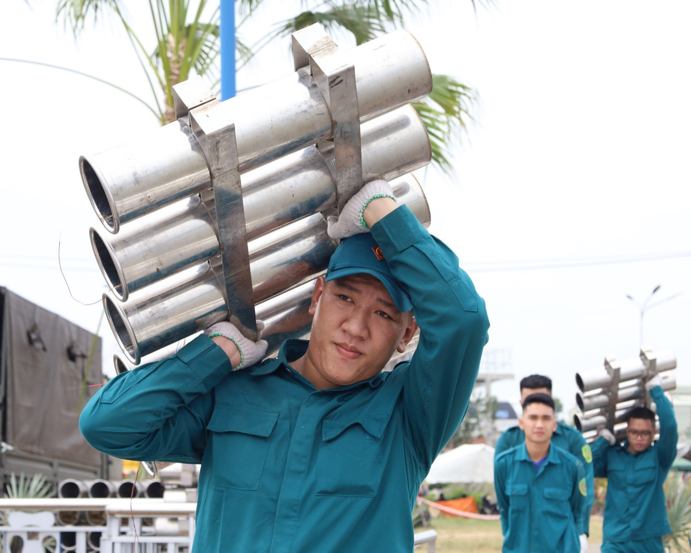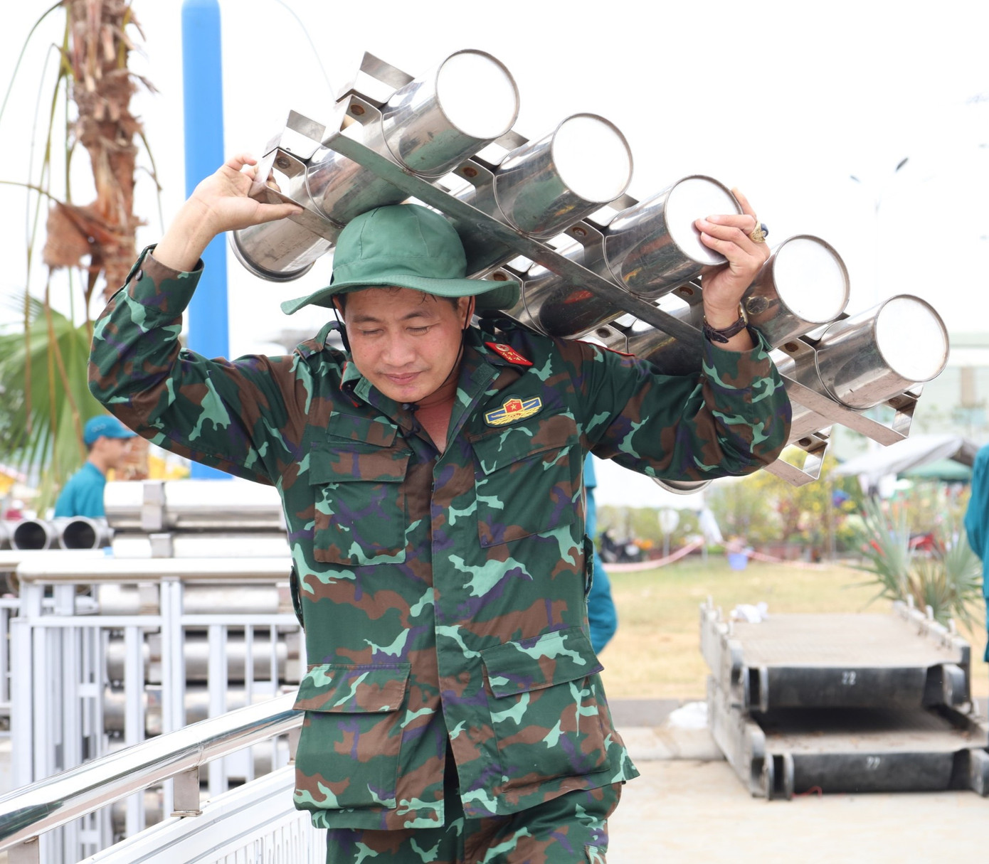 | Gần 100 cán bộ, chiến sĩ thuộc Bộ Chỉ huy Quân sự thành phố Cần Thơ tham gia công tác chuẩn bị cho màn pháo hoa tầm cao 15 phút, bắt đầu vào thời khắc Giao thừa Tết Giáp Thìn 2024. |