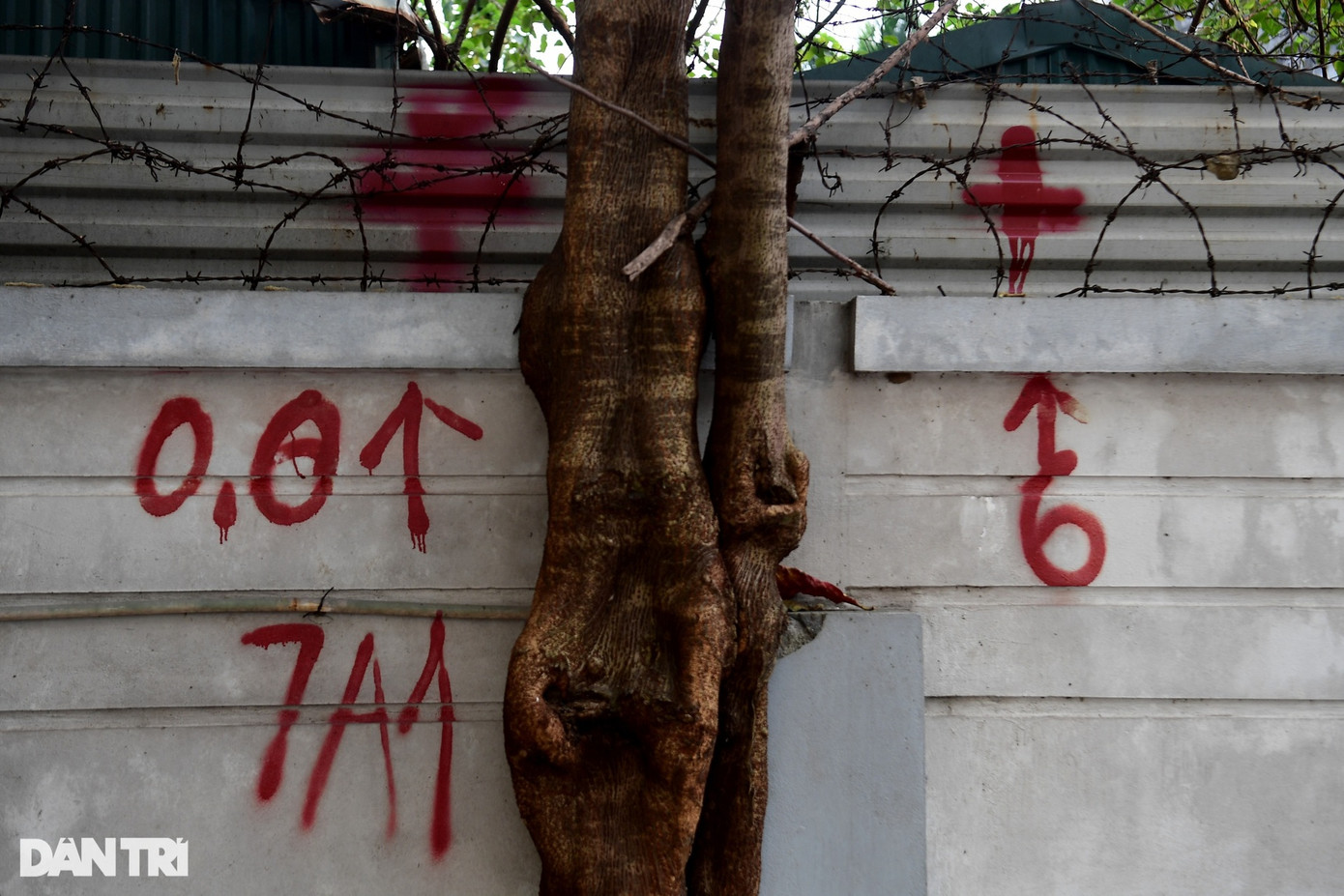 | Hiện các đơn vị chức năng đã đặt, vẽ mốc chỉ giới tại khu vực sân chung cư 25 Lạc Trung và lối vào hầm để xe của tòa nhà VTC. |