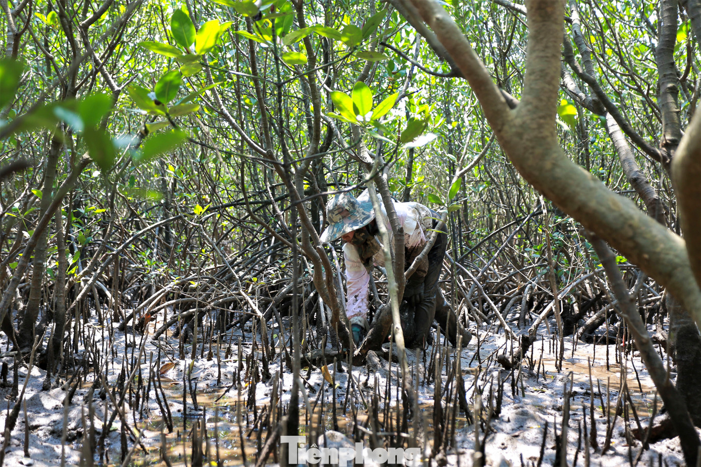 Những phụ nữ len lỏi qua những lớp cây chằng chịt, lặn ngụp trong bùn lầy để săn cua biển.