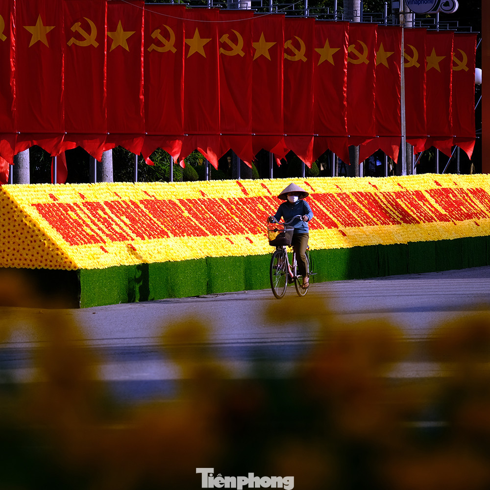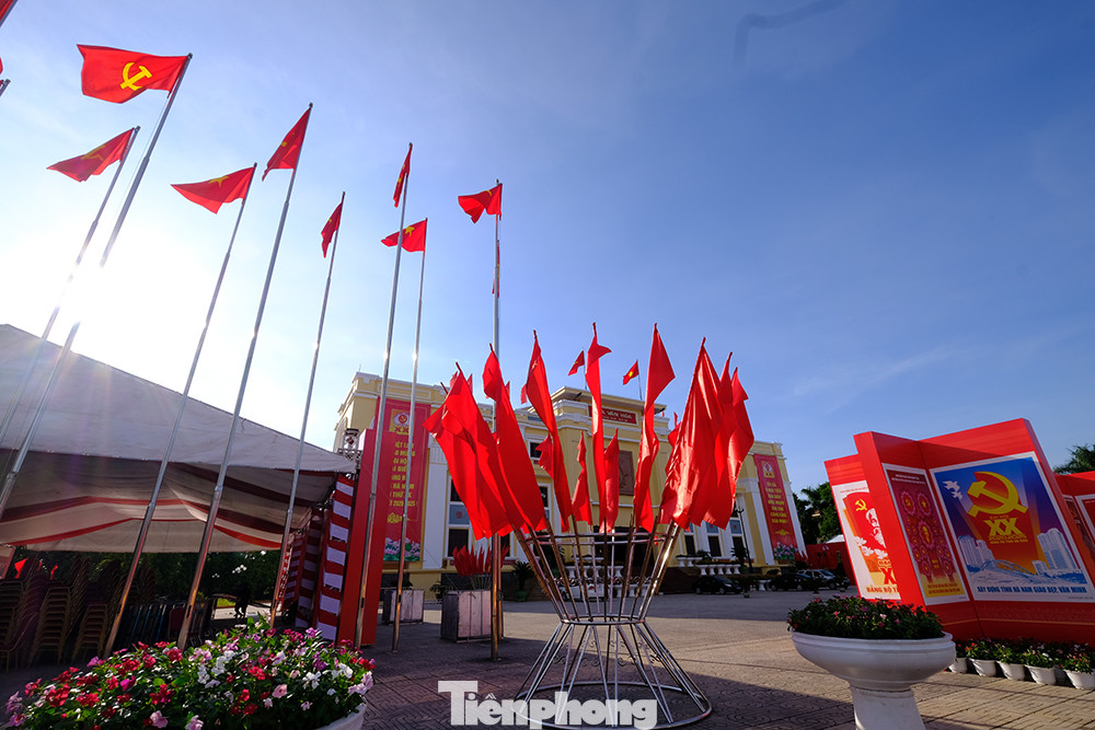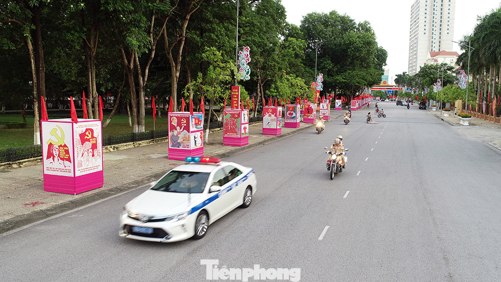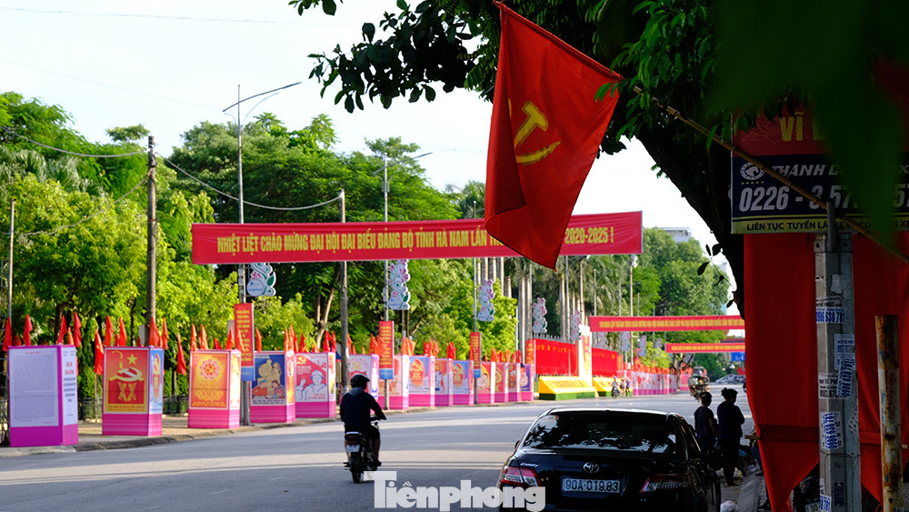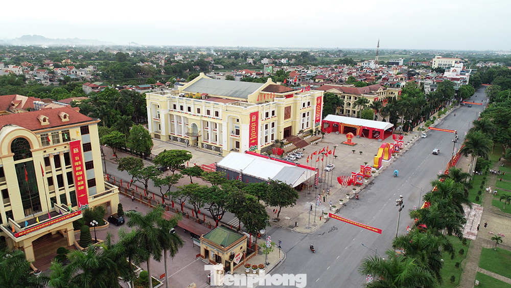Cờ hoa rực rỡ sẵn sàng cho Đại hội Đảng bộ tỉnh Hà Nam nhìn từ góc nhìn trên cao.