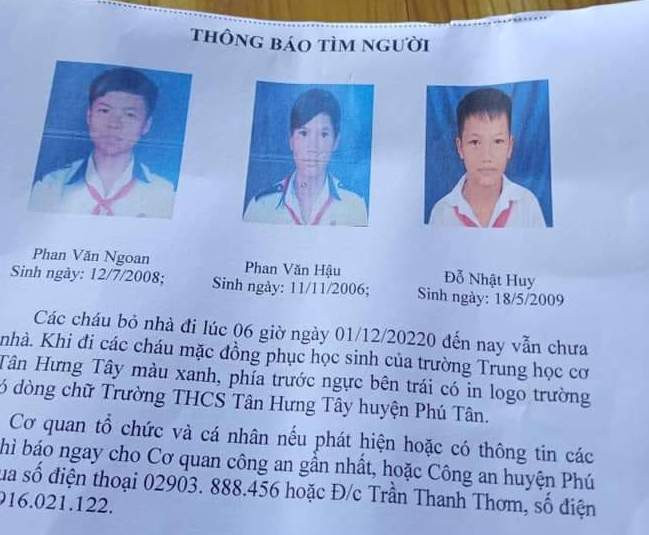 Sở GD- ĐT tỉnh Cà Mau cho biết, ba học sinh Trường THCS Tân Hưng Tây, xã Tân Hưng Tây (huyện Phú Tân, tỉnh Cà Mau) là: Phan Văn Hậu (sinh ngày 11/11/2006), Phan Văn Ngoan (sinh ngày 12/7/2008) và Đỗ Nhật Huy (sinh ngày 15/8/2009) ở cùng bà nội để cha mẹ đi làm công nhân tại TPHCM. Sáng 1/12/2020, 3 học sinh này đạp 3 xe đạp đi tìm mẹ cha làm ăn xa. Thời điểm đó, 3 học sinh chỉ có 55.000 đồng.