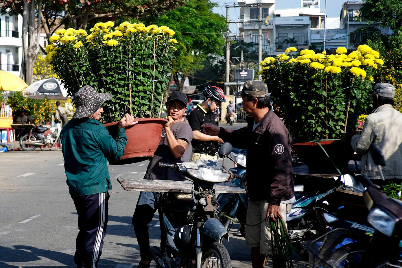 Tại chợ hoa Tết Đà Nẵng, những người bận rộn, tất bật nhất không phải là thương lái bán hoa hay khách mua hoa, những người bận rộn nhất là những người làm nghề bốc xếp, chở hoa thuê. Ngày 28 tháng Chạp, chợ hoa Tết tấp nập kẻ mua người bán, những chuyến xe thồ chở hoa Tết cũng nhộn nhịp theo chân khách mua đi khắp những nẻo đường, những con hẻm Đà thành.