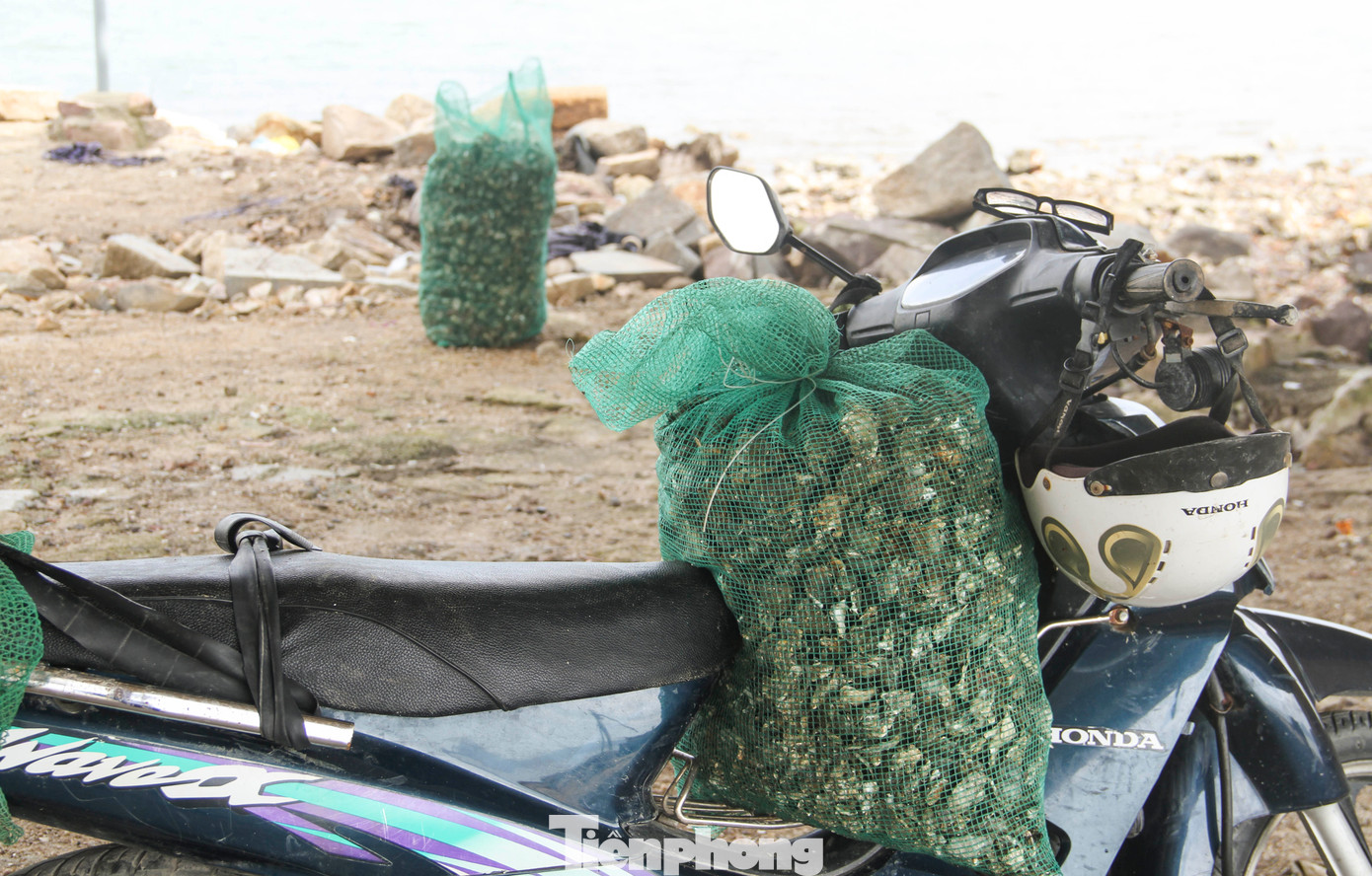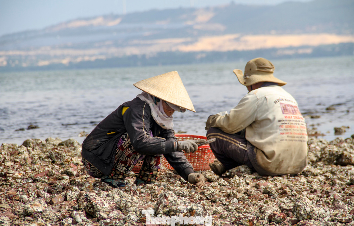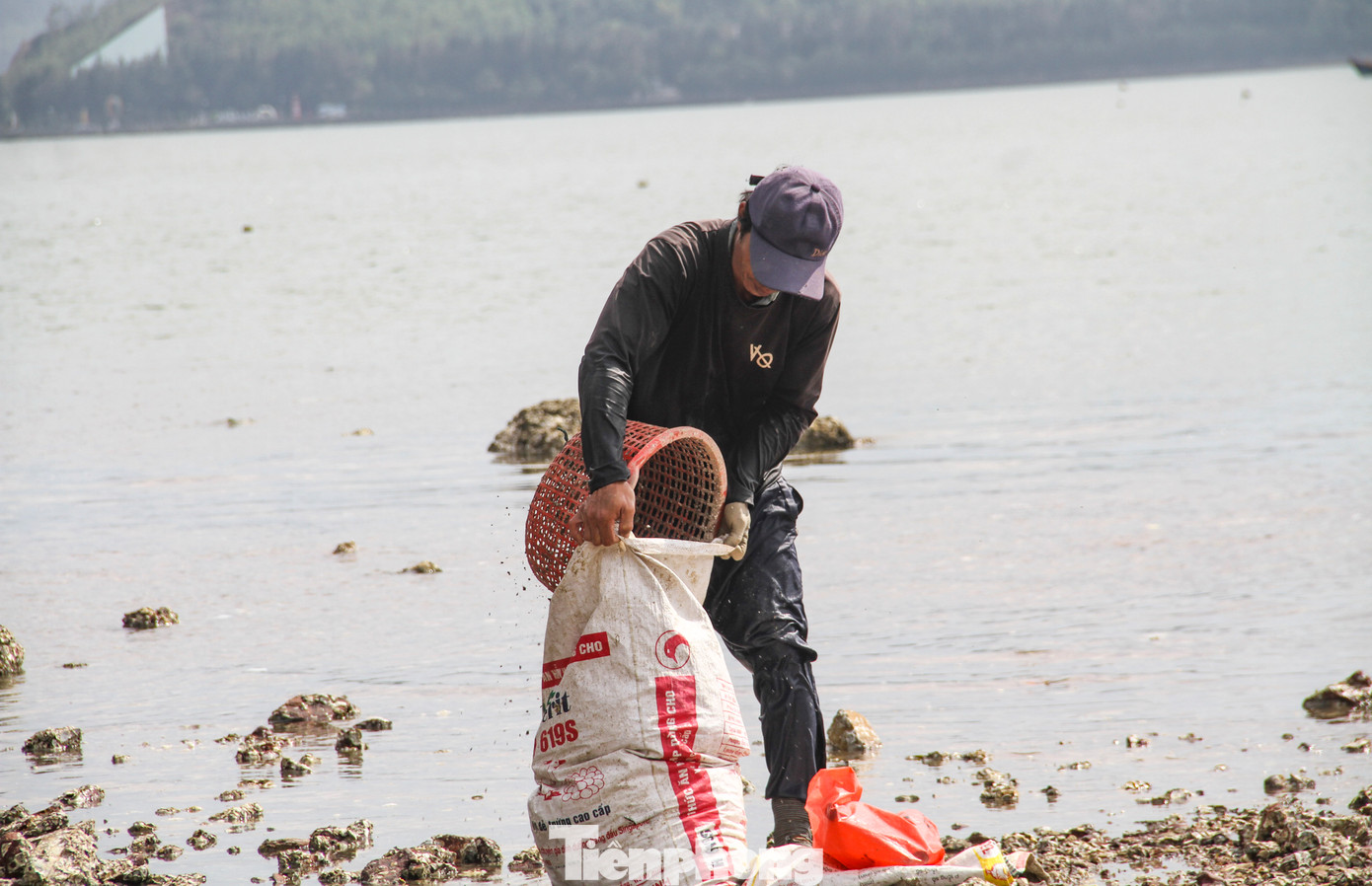 Bà Loan cho hay, tùy theo ngày, nếu đến sớm thì đục được nhiều hàu, còn muộn thì ít hơn. Sáng nay bà cùng một số người thân đục được hơn 50kg. Số hàu này được thương lái thu mua với giá 3 ngàn đồng/kg, để họ mang vào thị xã Sông Cầu (Phú yên) bán cho những người nuôi tôm hùm để làm thức ăn cho tôm. (Ảnh: Trương Định)